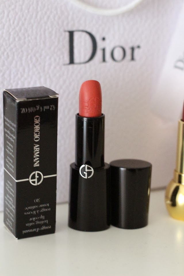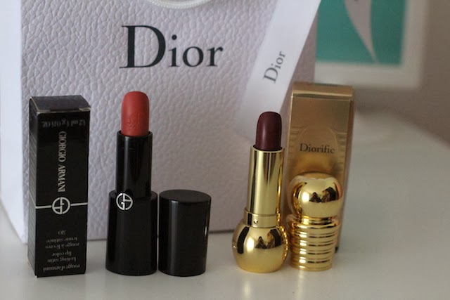 Einen Nudeton von Armani (Empfehlung von Lu – DANKE!) und einen beerigen dunklen Ton von Dior. Leider verläuft der Lippenstift von Dior ein bisschen (trotz Konturenstift).