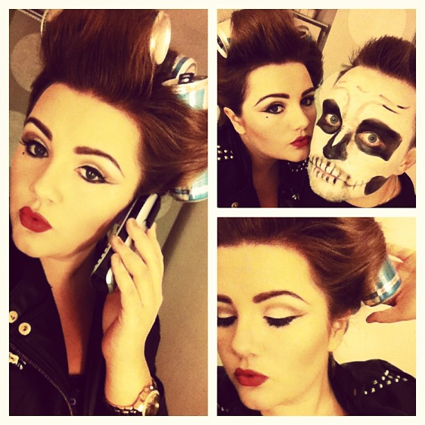 Dazu hab ich mich auch so heftig geschminkt und mir Dosen als Lockenwickler ins Haar (hier hätte ich jetzt die blonden Haare gebraucht!!!).