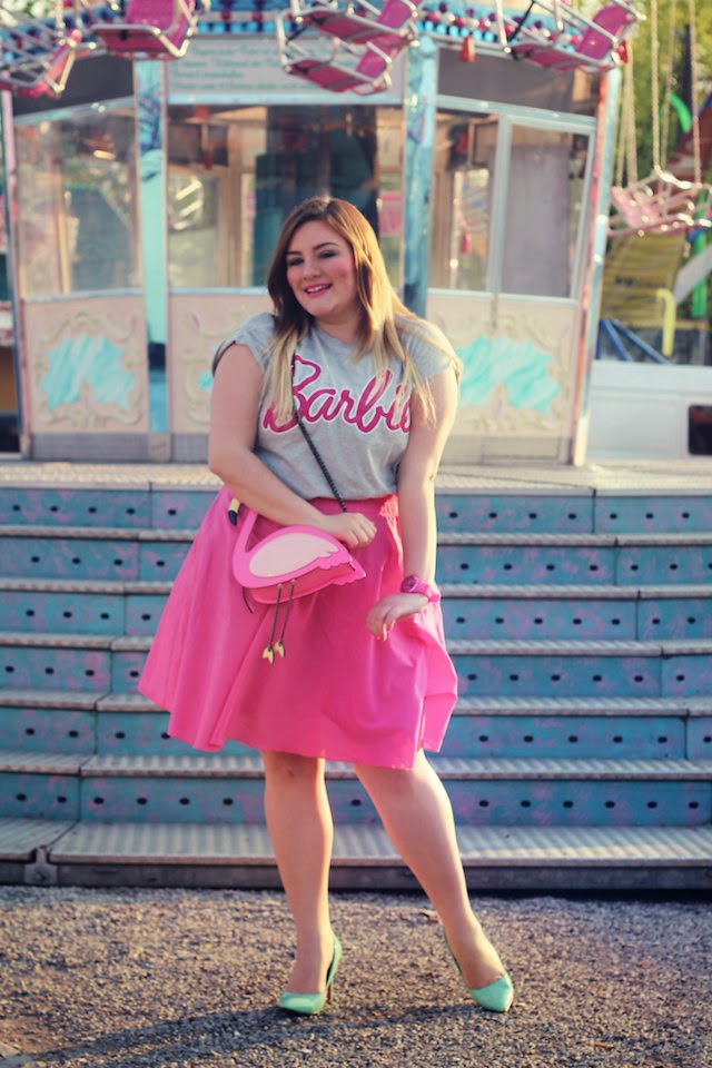 Das absolute Highlight an diesem Outfit ist definitiv die Flamingo Tasche von Moschino Cheap and Chic via Fashionette. Der pinke Vogel hat es mir sofort angetan und ich musste irgendwie gleich an Barbie denken. Da das Thema Plus Size Barbie in letzter Zeit immer mehr in den Medien diskutiert wurde, habe ich mich in diesen pinken Rock geschmissen und bin mit meinem Haus- und Hoffotografen auf den noch leeren Augsburger Plärrer spaziert. Bisher hatte ich noch nie die Gelegenheit diesen schönen Rock zu tragen, welchen ich vor einiger Zeit bei der bezaubernden Katha im Blogsale gekauft habe – der Flamingo brachte mich endlich dazu 🙂