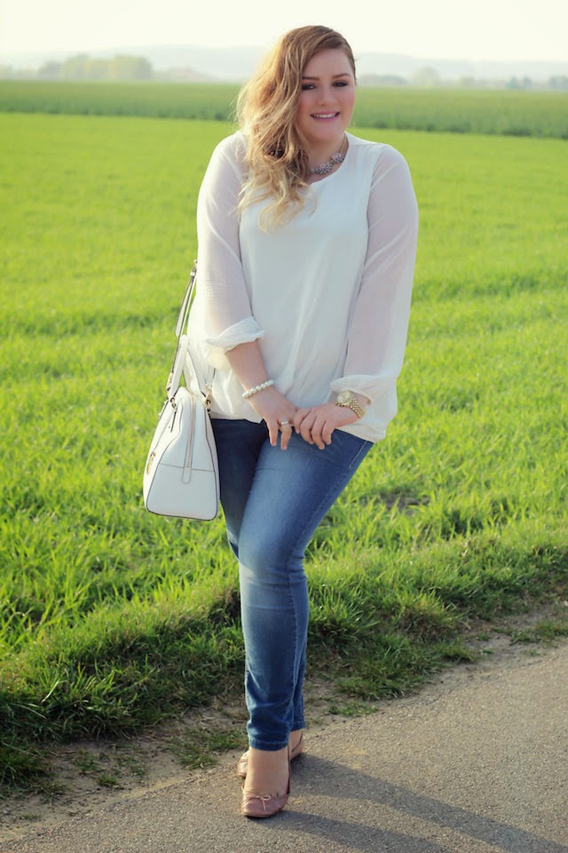 This outfit I have already presented to you in an outfit video – I link you the video again in the post, if you would like to see it yet. The white blouse I’ve bought in London at Evans and she’s a mix of tunic and blouse. It turns out nice and fluffy, and consists of several thin layers of material and is therefore not transparent. Often loose white blouses are always so extremely transparent and it is often difficult to avoid, that you still have to wear a top underneath (which I absolutely can not stand). I hope you like the outfit 🙂
