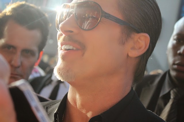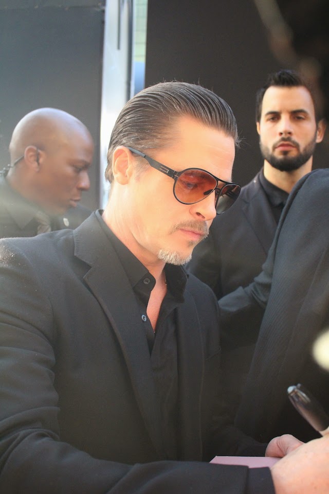 Aufgeregt war ich ja schon, als wir mit der Menge am blauen Teppich (ja, der Teppich bei der Premiere von Maleficent war nicht rot) auf die großen Stars Angelina Jolie und Brad Pitt gewartet haben. Was für ein Glück, ich stand tatsächlich ganz vorne bei einem “Promikenner”und so kamen auch alle Celebs zu uns. Alle kannte ich gar nicht – aber es kamen z.B. alle Elfen und Schauspieler aus dem neuen Film und der Vater von Angelina Jolie John Voight. Donald Faison (bekannt aus Scrubs) lies sich auch kurz blicken und war genauso wie im Fernsehen – einfach nur super nett und sympathisch. Als letztes kamen SIE dann – Angelina Jolie & Brad Pitt! Was für ein Anblick – Wahnsinn. Ich steh ja schon seit ich ein junges Mädchen bin total auf Promis und hab schon einige große Persönlichkeiten aus Film und Fernsehen gesehen, aber dieser Tag war definitiv das Highlight in meiner “Meet & Greet Geschichte”. Brad kam Dank des “Promikenners” dann zu uns und gab uns Autogramme und posierte mit einigen Fans für ein Bild. Leider, wurde er kurz nachdem er mir ein Autogramm gab einen Meter weiter von dem irren Journalisten Vitale Sediuk angegriffen (im Fernsehen wurde darüber berichtet) und deshalb kam Angelina dann nicht mehr in unsere Richtung – Schade.