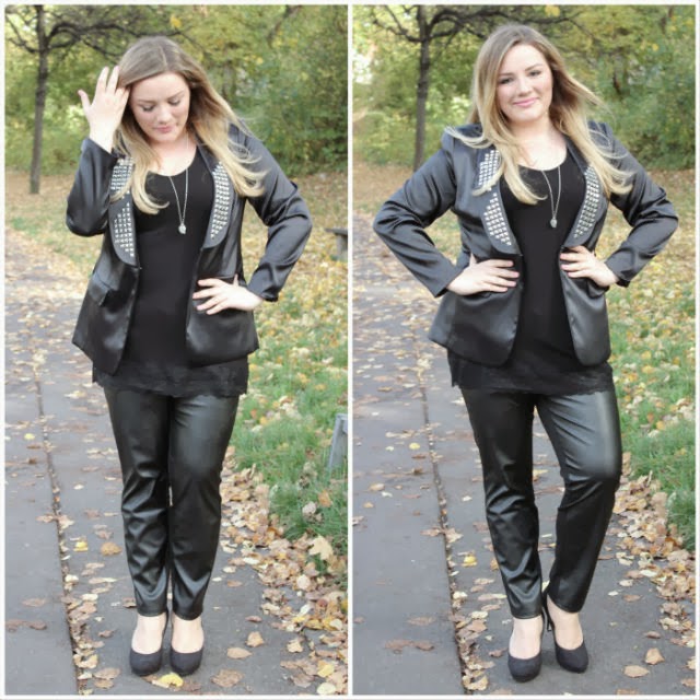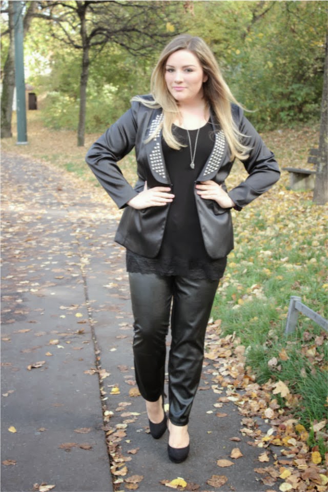 Heute möchte ich euch ein weiteres Outfit vorstellen. Ich bin momentan immer noch im Shootingfieber und nutze jede Möglichkeit bei dem schönen Herbstwetter tolle Outfitbilder zu machen bzw. machen zu lassen. Dieses Outfit steht ganz unter dem Motto “edel meets punk”. Wie ihr wisst liebe ich Blazer und dieser hier trägt sich so angenehm, ist chic und mit den Nieten ein absoluter Hingucker. Kombiniert habe ich ihn mit einem Spitzenlongtop und einer Lederimitathose. Den passenden Silberschmuck und Pumps dazu & ein edles Outfit mit dem gewissen Etwas ist fertig.