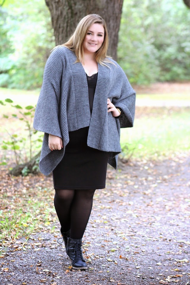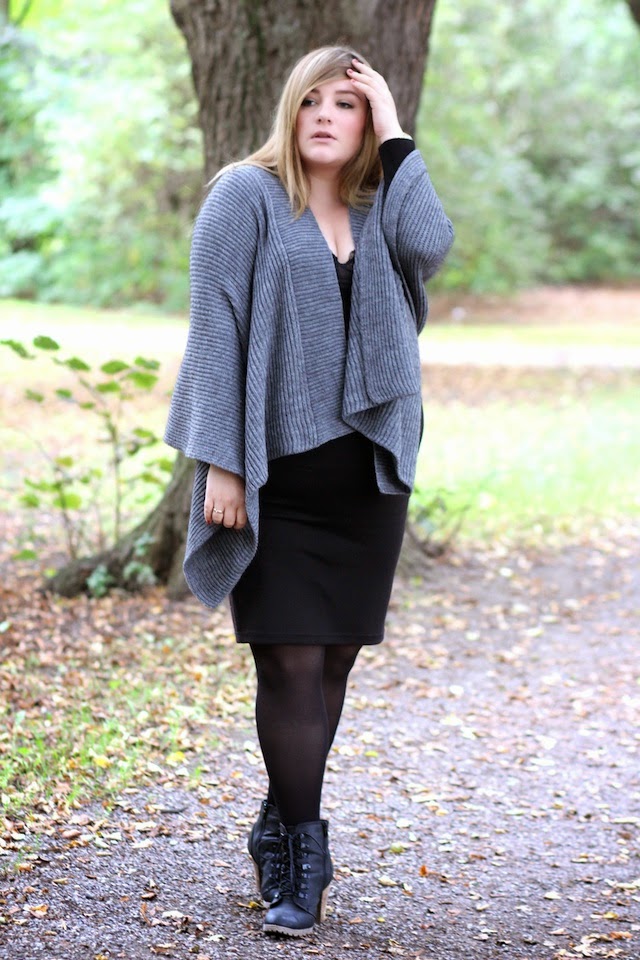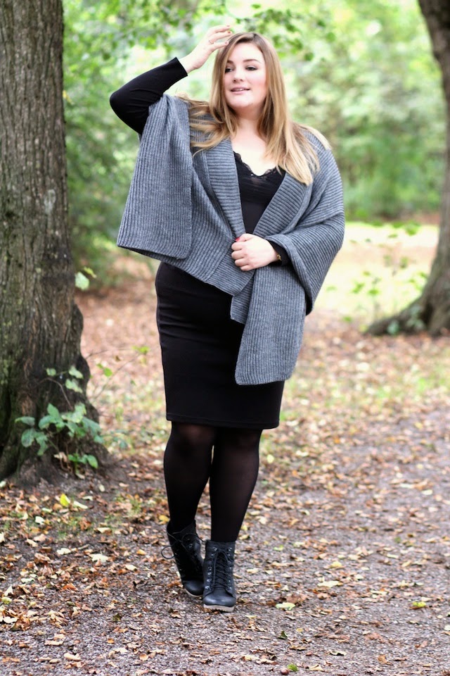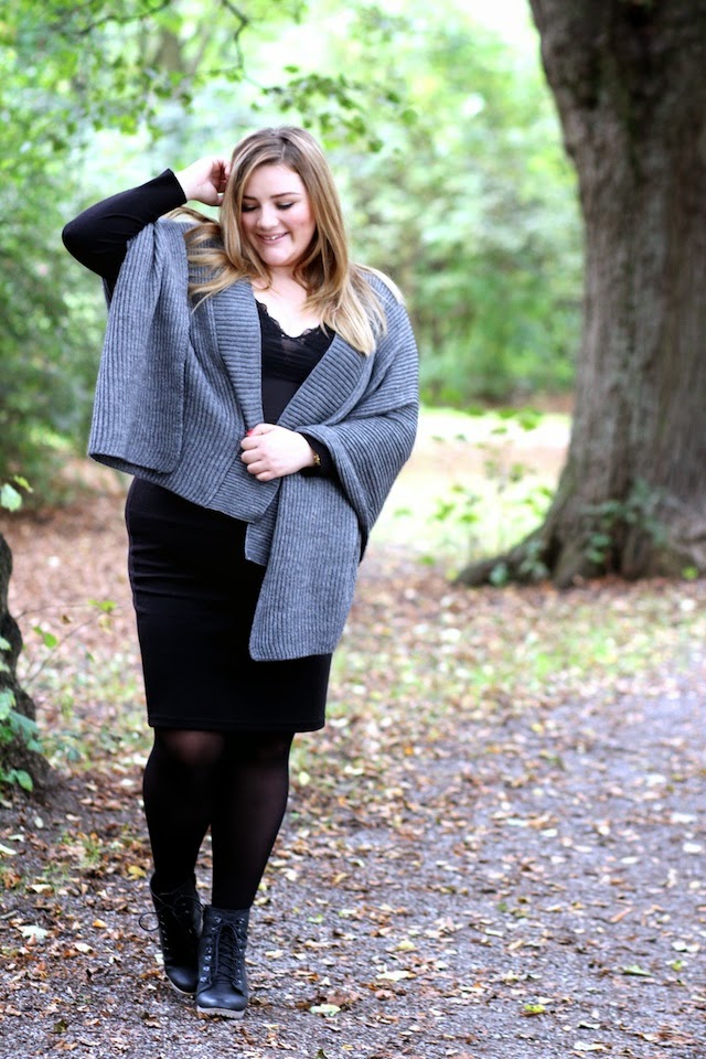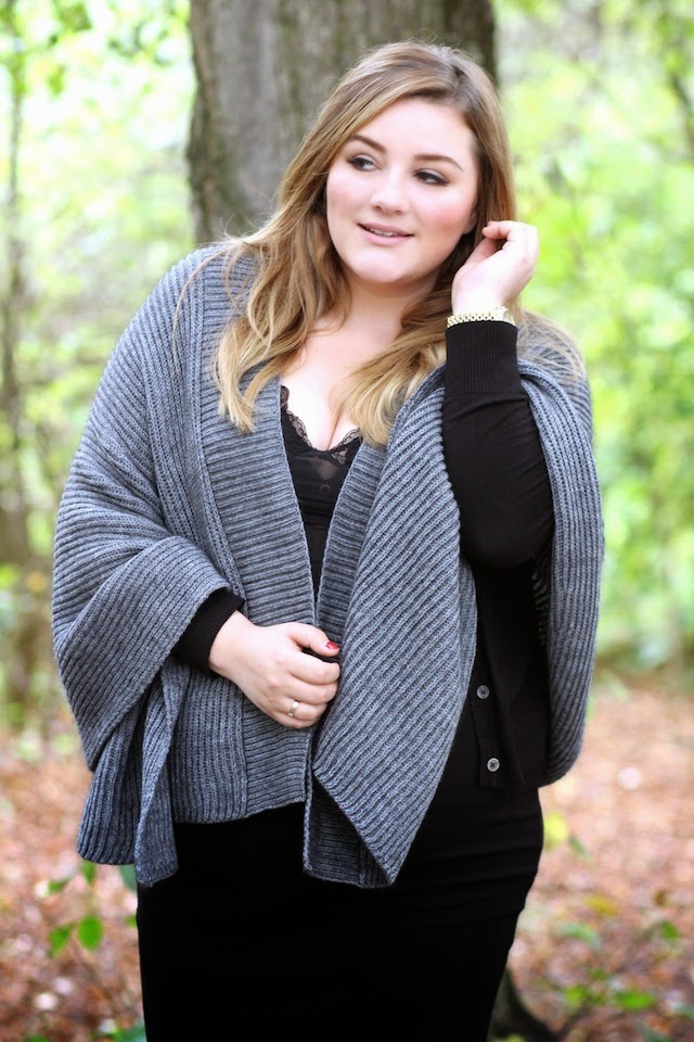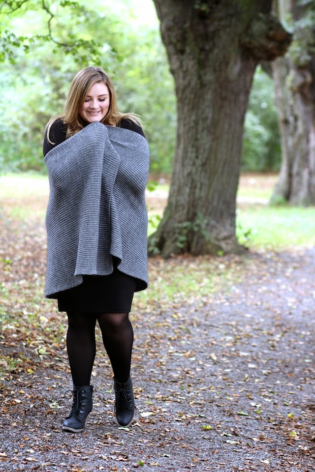 Der Herbst ist da und ich mag den Herbst sehr. Ich liebe warme kuschlige Wolldecken und Mäntel. Ganz große Liebe auf den ersten Blick war dieses graue Cape von Hallhuber. Auch wenn Hallhuber eigentliche keine Plus Size Kollektion hat (was ich im Übrigen sehr schade finde, da ich die Mode sehr gern mag), sind immer wieder ein paar Teile dabei die dann doch passen. Die Größen gehen wenn ich mich nicht irre bis 44 und dieses Cape hier könnte man mit einer 52 auch noch locker tragen wie ich finde. Ich will euch damit sagen, dass ihr nicht immer ein großen Bogen, um vermeintliche Geschäfte die eh nur Mode für schlanke Frauen produzieren, machen müsst. Dieses kuschlige Teil in “one Size” fiel mir sofort auf und ich fand ihn auch an mir gleich super und hab nicht lange überlegen müssen ob ich ihn nehme oder nicht. Ponchos und Capes sind eine tolle Übergangslösung und man kann sie an nicht so kalten Tagen einfach über einen Pulli schmeißen. Ich habe ein Spitzentop aus der “intimate Kollektion” von Britney Spears, eine dünne uralte Strickjacke und einen Bleistiftrock an. Wie steht ihr zu den neuen Trendteilen?