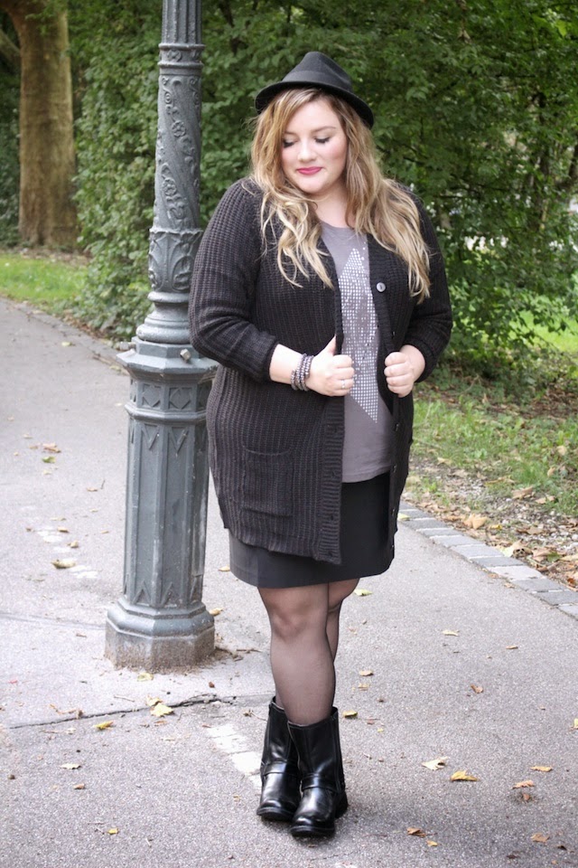 Heute zeige ich euch meinen Lieblingslook aus der aktuellen Geburtstagskollektion von sheego. Der herbstliche casual Look dominiert mit dem großen Glitzerstern auf dem Longshirt und hat das Motto Stars. Man könnte das Plus Size Outfit mit dem schwarzen Rock auch elegant und edel stylen, aber ich hab mich hier jetzt für die rockigere Variante entschieden. Kombiniert mit meinem Hut und den coolen Boots aus dem Shop hat der Look so bisschen was von London – keine Ahnung warum es mich daran erinnert, aber da tragen die Menschen mehr Hüte und stehen auch dazu. Für die noch nicht so kalten Tage eignet sich immer gute eine warme kuschlige Strickjacke. Besonders toll finde ich zur Zeit lange Cardigans wie diesen hier, weil sie dem Outfit was cooles und lockeres verleihen. Das Shirt gibt es übrigens auch noch in anderen Farben (wie z.B. petrol oder dunkelrot). Schaut euch unbedingt die neuen Herbsttrends bei sheego an und lasst euch von mir hierzu inspirieren.