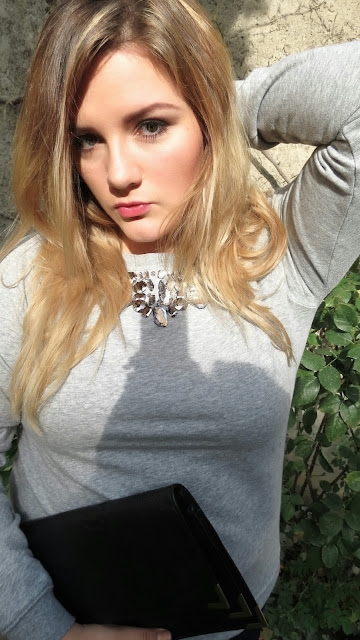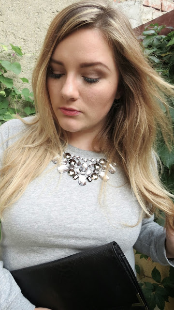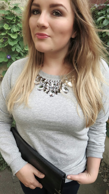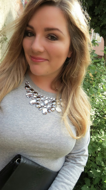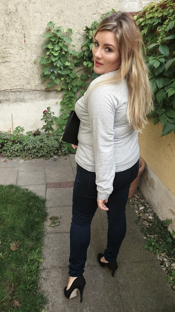 Diesen Sweater hier habe ich euch bereits in einem Post vorgestellt. Er ist von Hallhuber und ist top aktuell mit den schönen Steinchen am Kragen. So sieht er dann getragen aus.